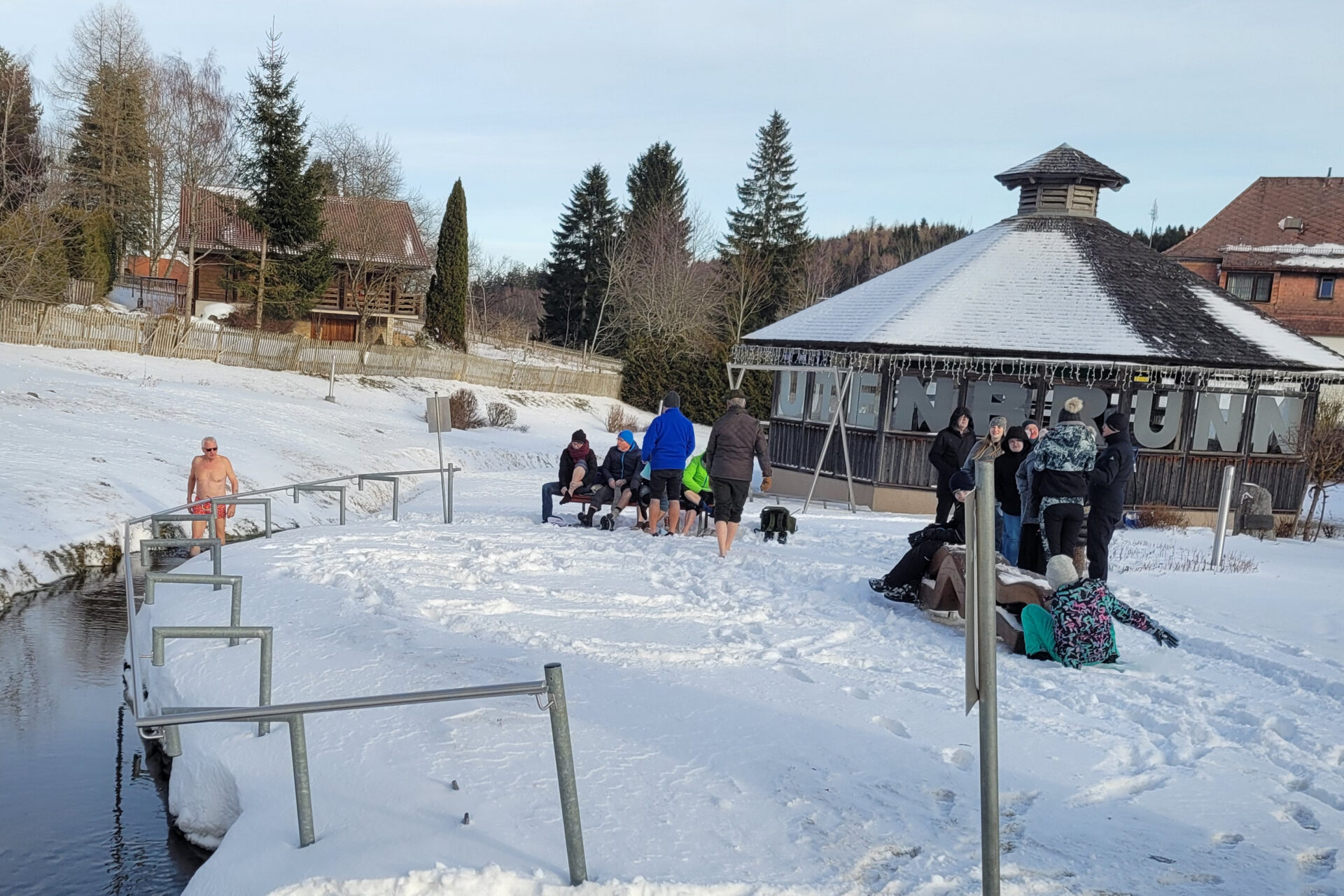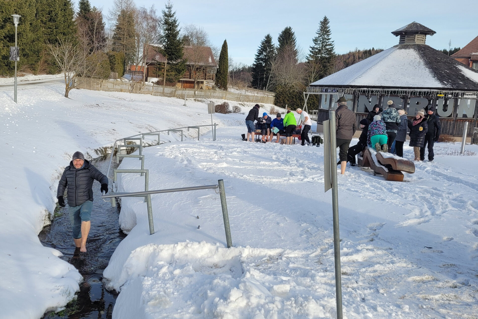 Mit neu­er Ener­gie star­te­te der His­to­ri­sche Ver­ein bei win­ter­li­chen Tem­pe­ra­tu­ren mit dem tra­di­tio­nel­len Neu­jahrs-Kneip­pen ins Jahr 2026. Beim bewähr­ten Was­ser­tre­ten wird der Kreis­lauf ange­regt, das Immun­sys­tem gestärkt und Erkäl­tun­gen vorgebeugt.